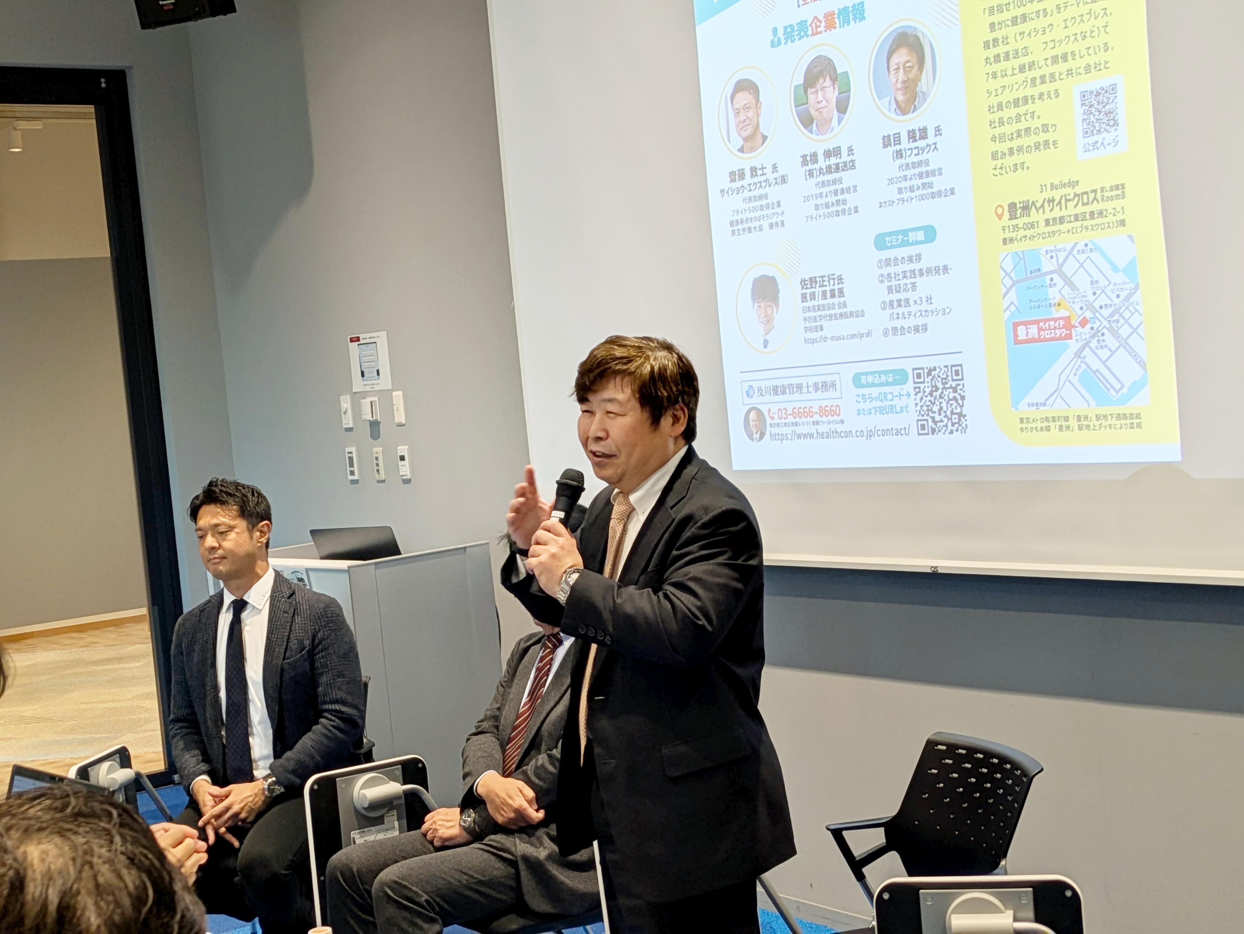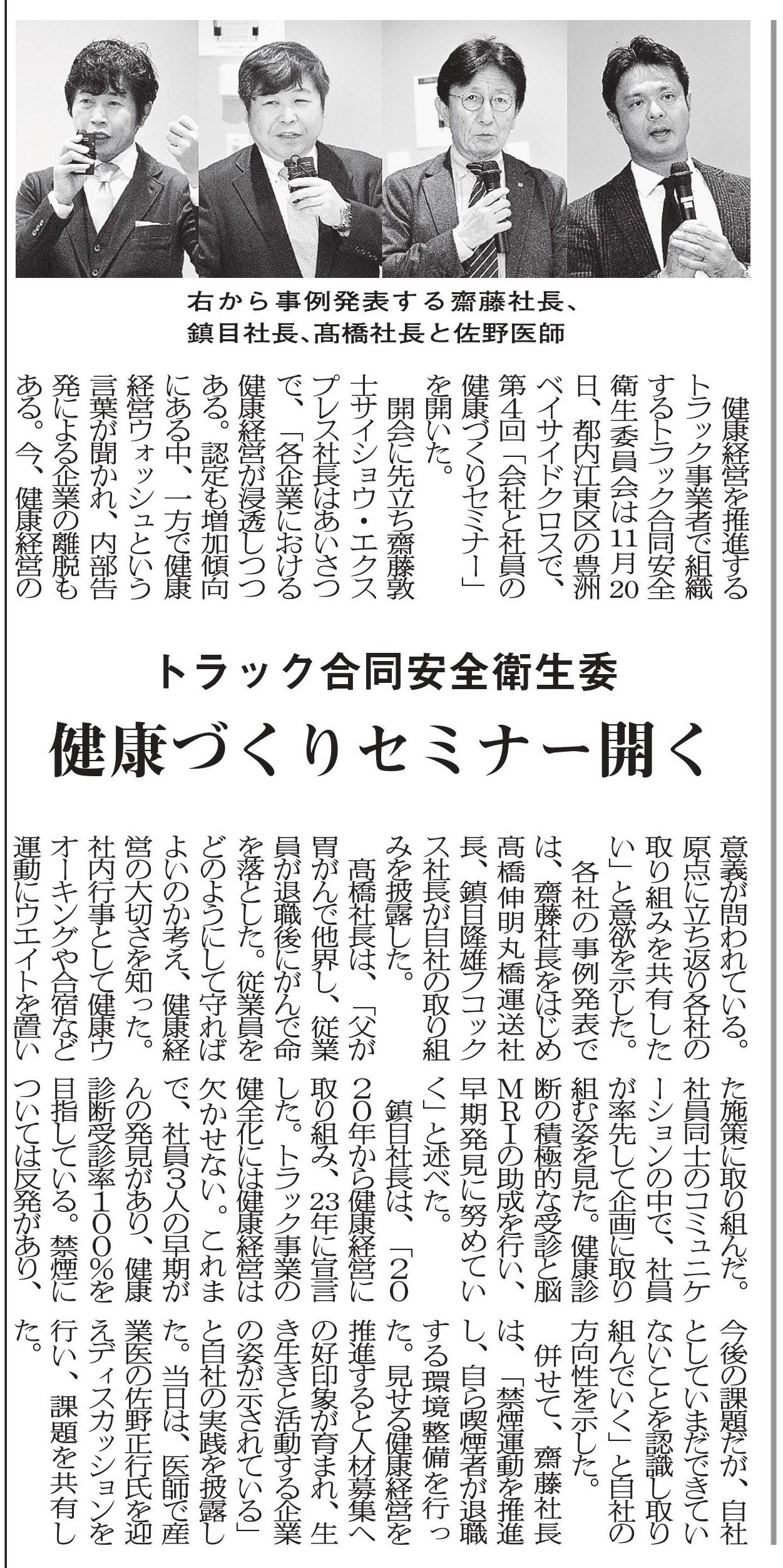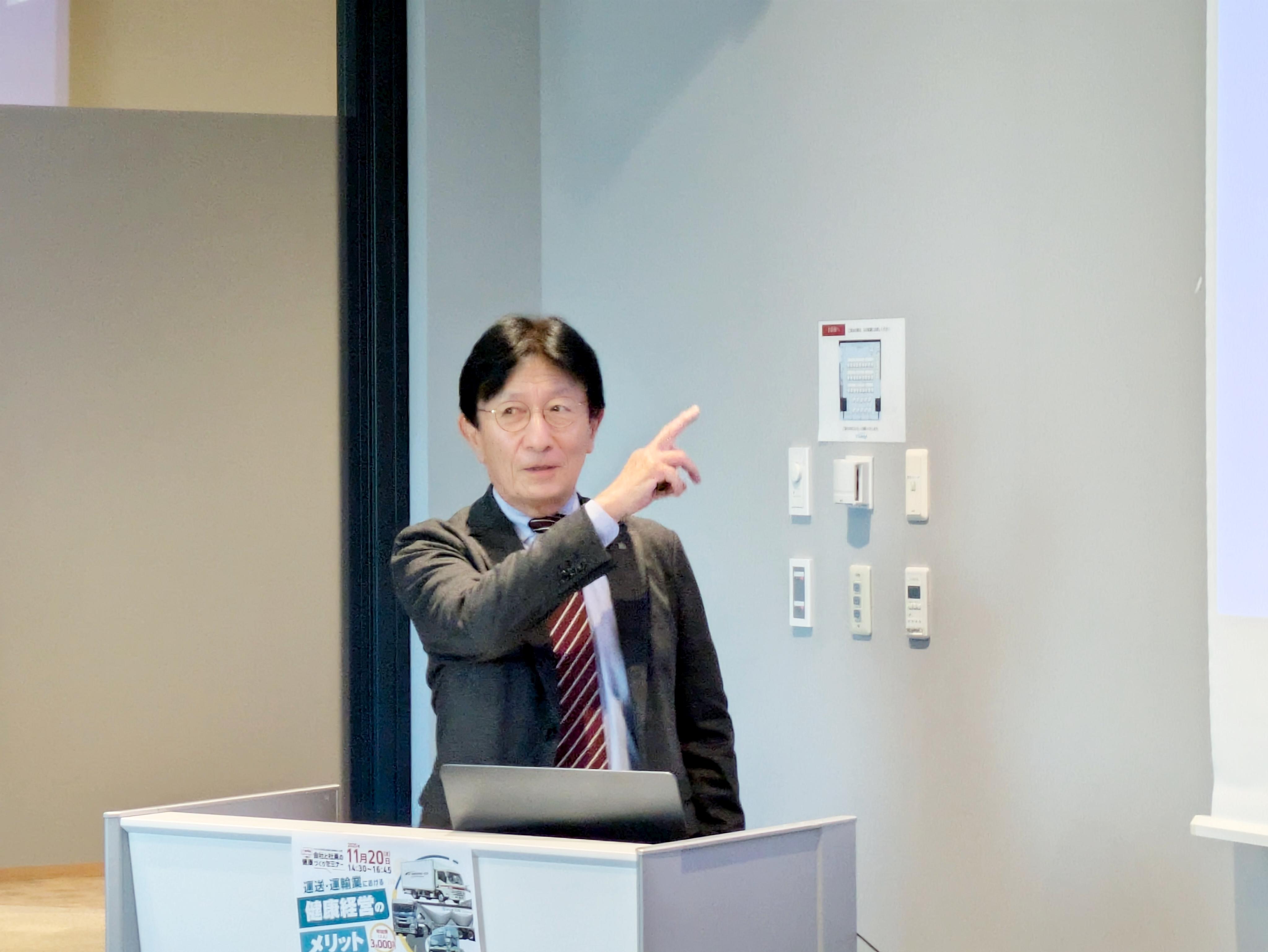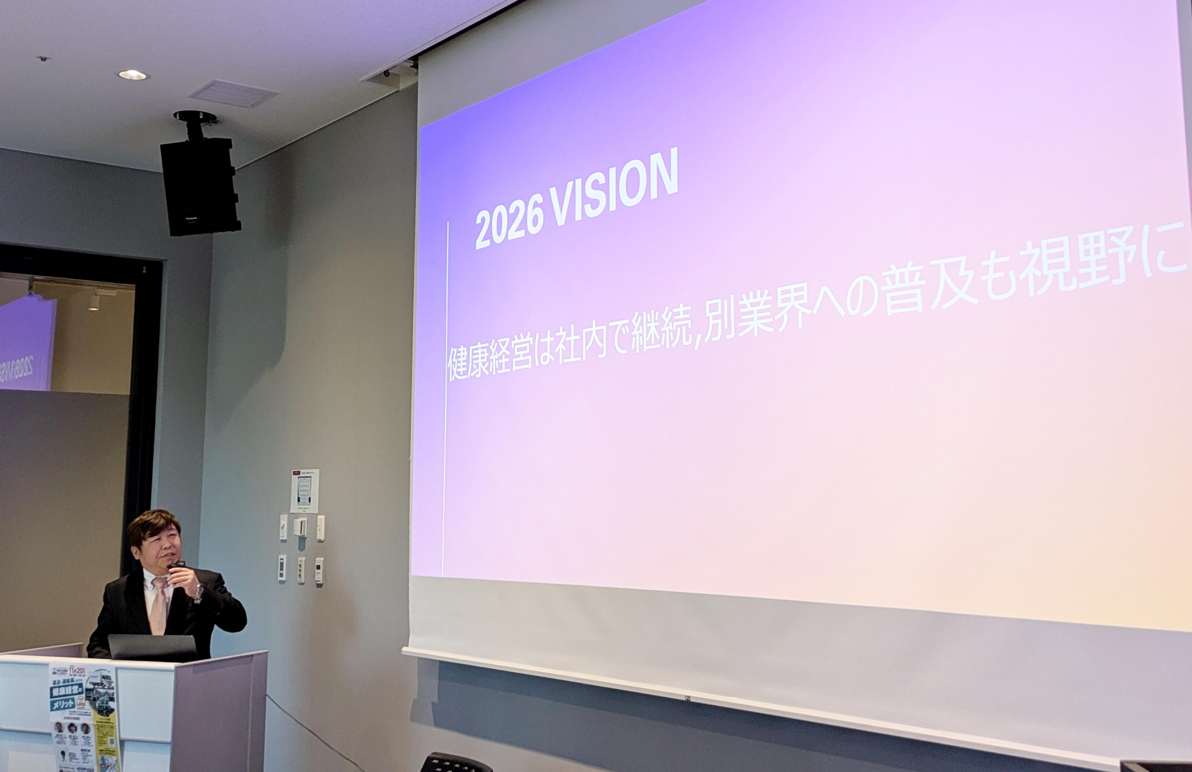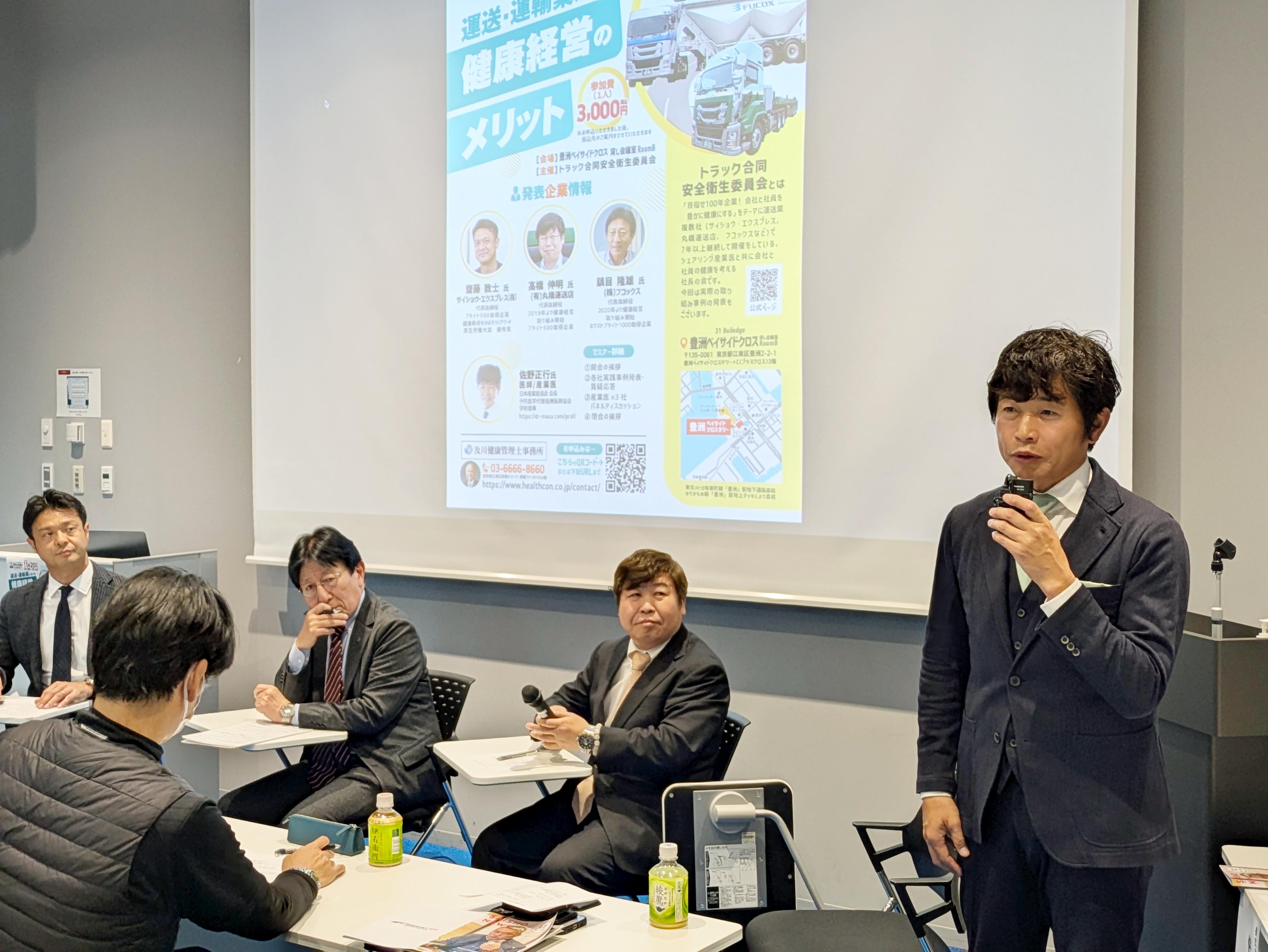 産業医による健康や幸福に関する講話から運送業の2024年問題について賃金交渉の話からドライバー確保に向けた採用の取り組みなど業界や各社の課題を具体的に取り上げて、情報交換や課題解決に向けての取り組みを行っています。